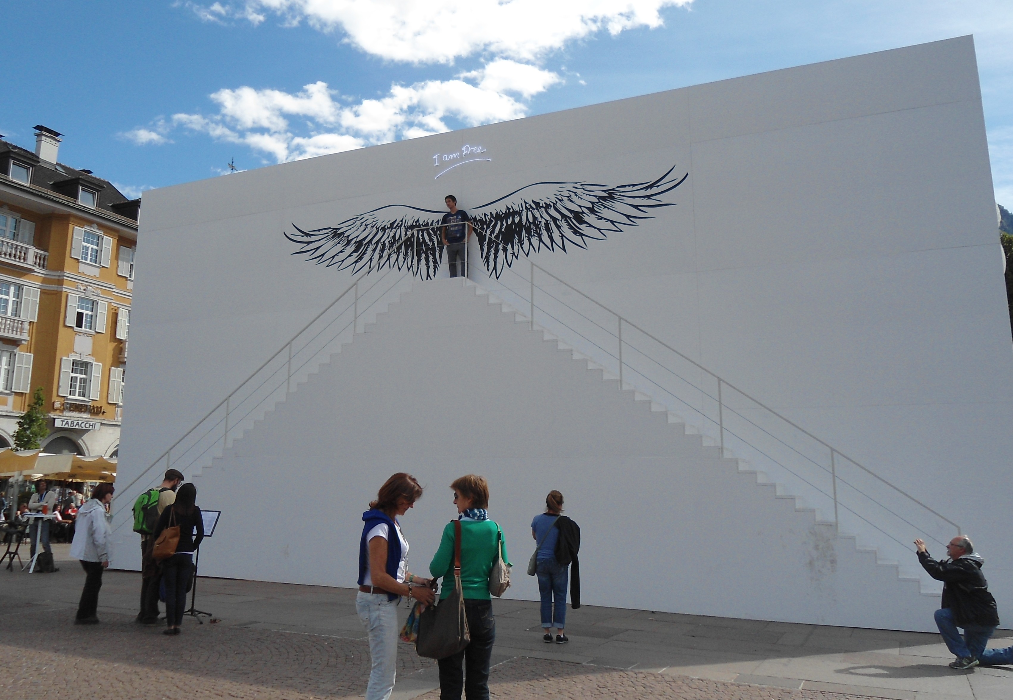 Am Tag nach der Sella-Runde bin ich noch ein wenig Richtung Süden gefahren. Im Norden wäre eh nur schlechtes Wetter gewesen. Hier ein Foto von einem sehr interessanten wie lächerlichen Gimmick zugleich, eine auf dem Waltherplatz aufgebaute Kunstinstallation mit dem Titel “I am free”. In der unten aufgestellten Tafel zur Erklärung stand sinngemäß, dass jeder Mensch frei sei, frei nach einem gewissen Vilayat: “Realize your freedom, and you are free.”