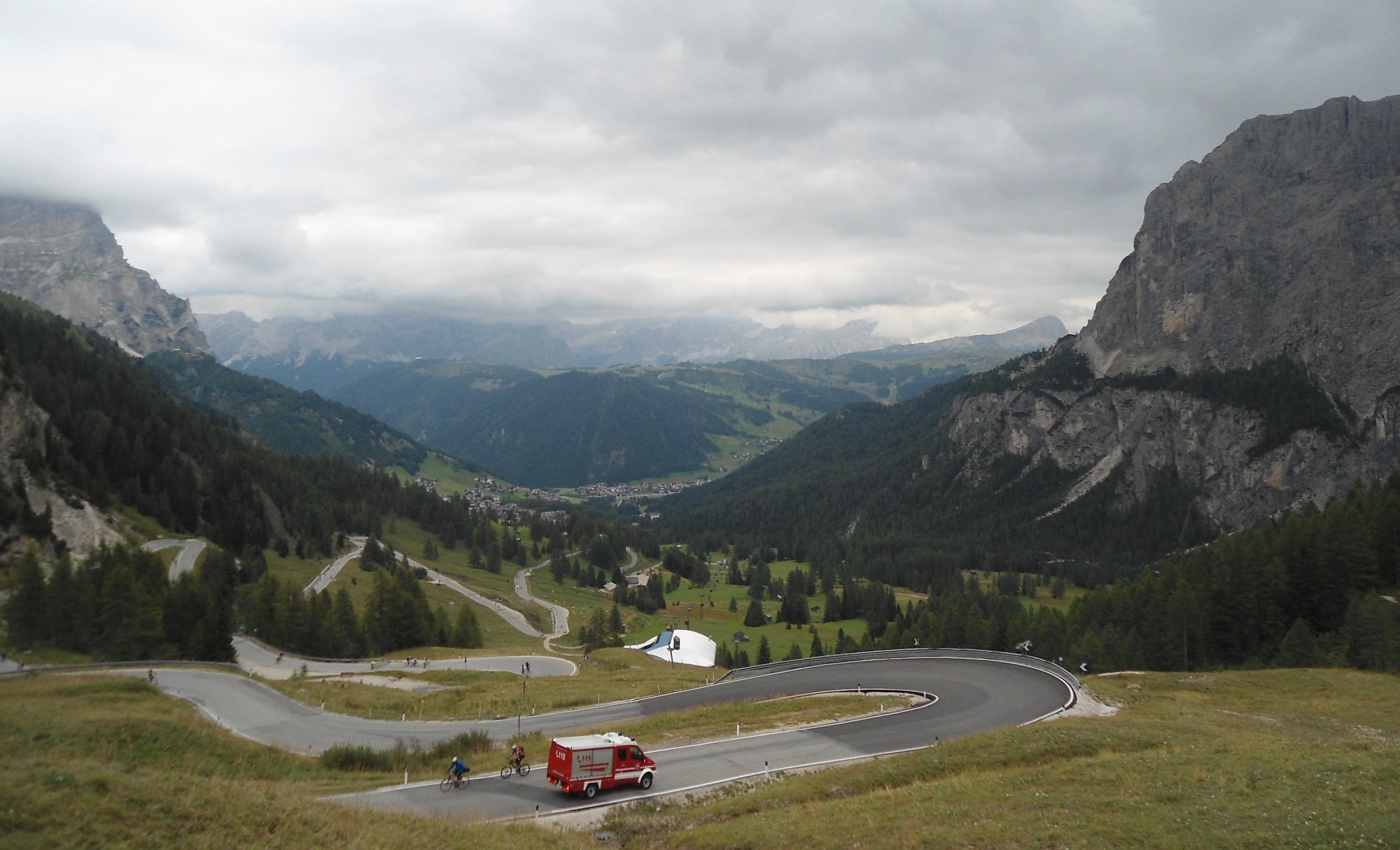 Blick zurück vom Grödnerjoch. Die Einsatzfahrzeuge von Polizei und Rettungsdiensten waren glücklicherweise (bis auf wenige versprengte Camper) die einzigen Kraftfahrzeuge auf der Strecke.