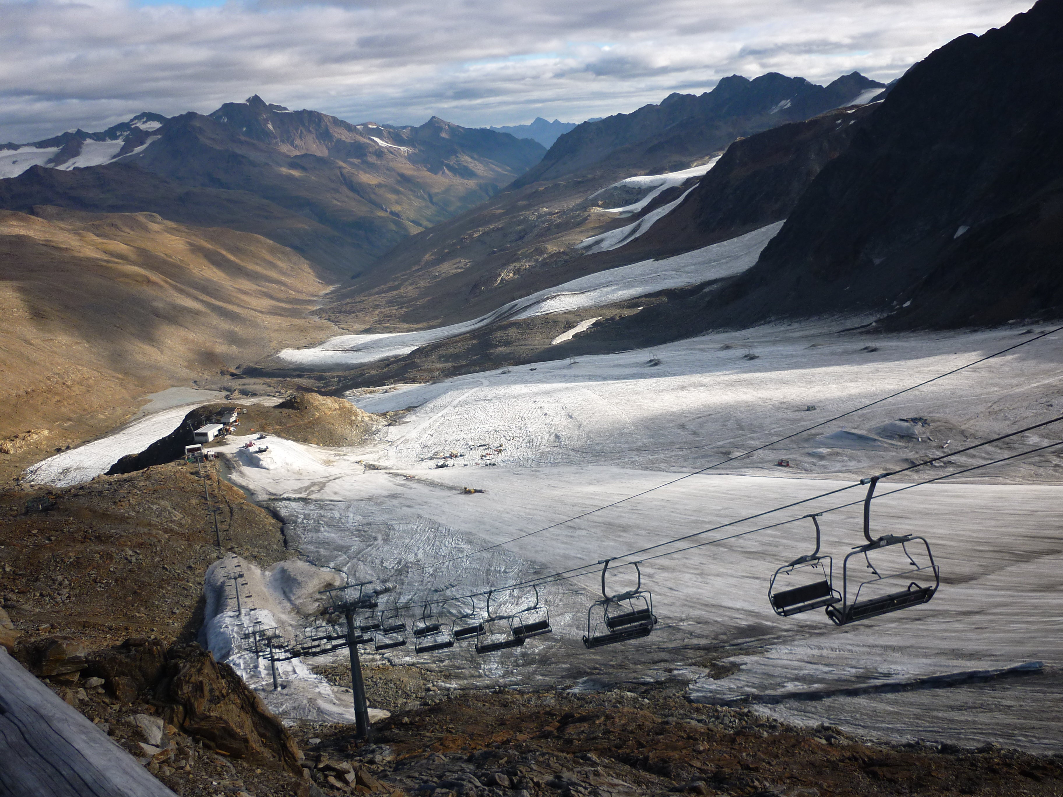 At Tisenjoch, View to Stubai Valley, the glacier partly covered with plastic sheet. Interesting as well are all the machines and construction parts, scattered over the ice. September 2011