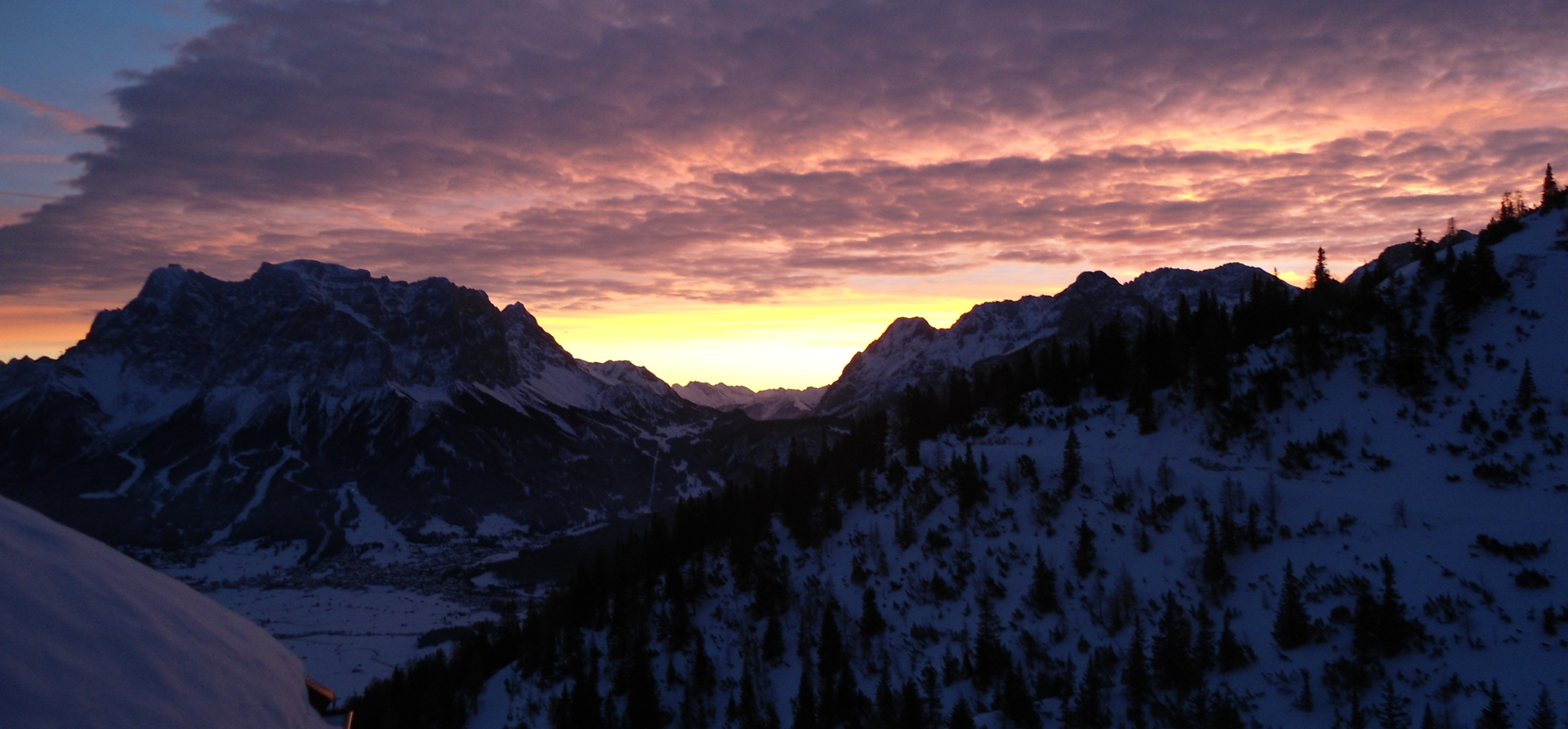 Rechts, das ist übrigens, wie auf allen Bildern, die Mieminger Kette und davor die Sonnenspitze. Man beachte ihren Schattenkeil überm Tal im zweiten Bild und die schönen Wolken im Karwendel (rechts). Auf Anfrage gibt’s auch lustige Porträts von mir in Arbeitskluft vor der Kulisse 😉